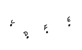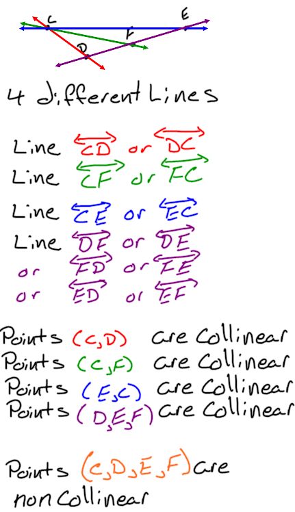 Problem: Given the following points: C, D, F, & E ![]() How many different lines can we make? What are the names of each line? Which points are collinear? Which points are noncollinear? |
