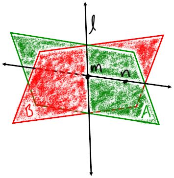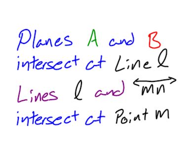Create a figure with the given information from problems 11 - 15 11. Create 2-planes A and B, that intersect each other. 12. Draw and label the intersection of planes A and B as