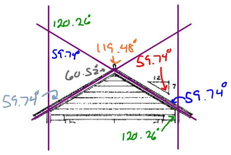 Solution:![]() On the front elevation of the garage you notice the triangle with a "12" and a "7" and ask your "Math Teacher" what this all means. Your teacher mentions that it is a triangle ( which of course you know ) and that we will be looking at triangles in the next chapter. You then ask about the numbers, and your teacher tells you that it identifies slope. Finally you ask what the angle measure is. Your math teacher tells you that Trigonometry is needed ( Chapter 7 ) to find the angle measure, and then tells you that the bottom angle measure is 59.74° after punching a few buttons on the calculator. You wonder how knowing that helps and then you realize that you can figure the rest out with parallel lines and transversals. We know a few things about buildings, so we can draw out the following; ![]() Now we can find the rest of the angles: ![]() To find the angle at the peak of the roof we needed to use a little bit of what we know about triangles. Now we have all of the information we wanted. |