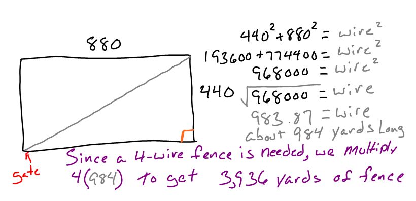 Question: A farmer has a rectangular pasture with a gate on one of the corners and he wants to split the pasture into two equal size pastures. The farmer decides to put up a fence to run diagonally through the pasture so he can access the either pasture from the gate. If the pasture is a half mile long ( 880 yards ) and a quarter mile wide ( 440 yards ) how much wire will the farmer need to make a 4-wire high fence in the pasture? |