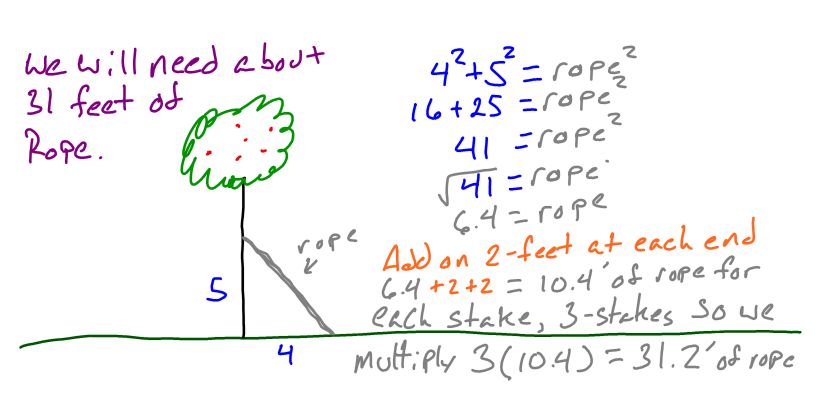 Problem: You want to plant an Apple tree in your back yard. When you buy the tree, the nursery suggested that you stake the tree with 3-stakes placed around the tree in a circle. Each stake should be about 4 feet from the tree and the tree should be supported about 5 feet above the ground. How much rope will you need if you want to have an extra 2-feet at each end to tie the rope with? |