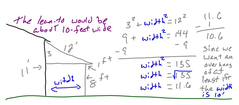 Question: You decide to build a lean-to on the side of a shed. The side walls of the shed are 11ft tall to the eaves and you want the inside height of the shed to be 8ft. You have 12' sheet steel panels to use for the roof and you would like to have an over hang of at least a foot on the outside of the lean-to. How wide could you make the lean-to, if you round to the nearest foot? |