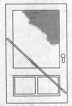 | 1. A screen door is sagging on one side and is out of square. A turnbuckle needs to be placed on the door ( as seen on the right ). If the door is 36 in 80 in ( W x H ) and one end of the turnbuckle is to be placed on the bottom right hand corner and the other end placed in the middle on the left side of the door. How long does the turnbuckle need to be? |