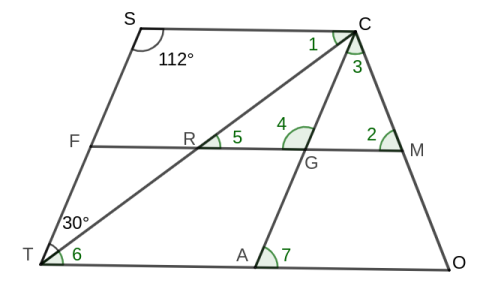 SC // FM, FM // OT, CA G is the midpoint of CA, M is the midpoint of CO find the measure of the following angles. |